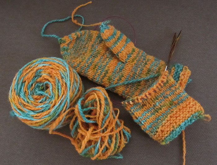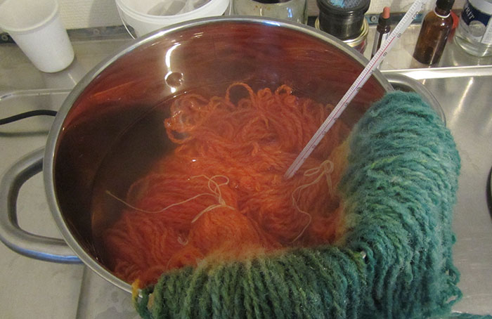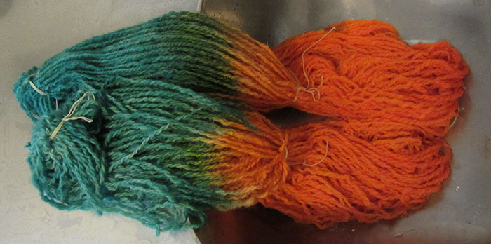 Med syrafärgning kan ull förvandlas till garn i regnbågens alla färger. Syrafärger är lätta att använda och tvättstugan, en spisplatta, termometer och stor kastrull är den utrustning som behövs. Tänk att få stå med nyspunna härvor vitt ullgarn och bestämma vilken färg de ska få. Sånt kärt besvär! En sån lycka! Jag älskar färg!!