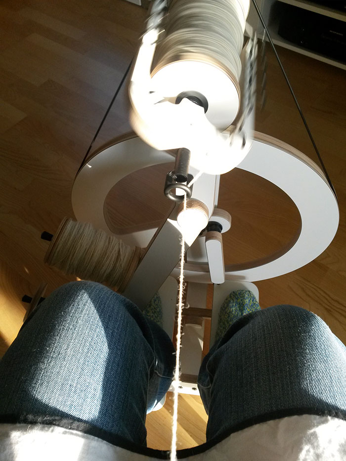 Jag är verkligen ingen mästare på att spinna, nybörjare som jag är. Men skit samma! Det är verkligen rofyllt att sitta och trampa spinnrocken och se hur kardfloren blir till garn. Att kunna se hur garnet blir jämnare och jämnare… Det gör mig lycklig.
