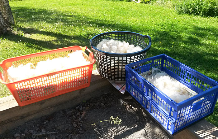 I somras skaffade jag min andra spinnrock, en begagnad Kromski Minstrel. Med i köpet följde flera fullpackade kassar med ull från svenska finullsfår. Under soliga och varma sommardagar passade jag på att tvätta ullen utomhus.