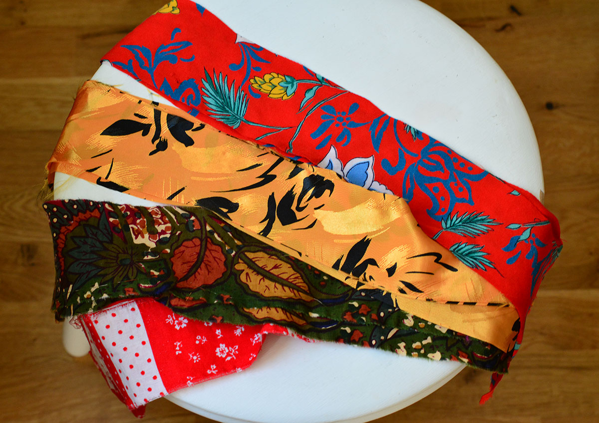 Klipp ut tygremsor med måtten 6 x 60 cm. Måtten på tygbiten är egentligen inte så jättenoga. Eftersom jag återbrukar tyger brukar de tygbitar jag har tillgång till få avgöra måtten. Men jag håller mig till 5-7 cm i bredd och 55-65 cm i längd på bitarna.